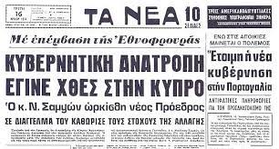 Ορίστηκε κυβέρνηση υπό τον Νίκο Σαμψών μετά την άρνηση τριών δικαστικών όπως και του Γλαύκου Κληρίδη να αναλάβουν την προεδρία.