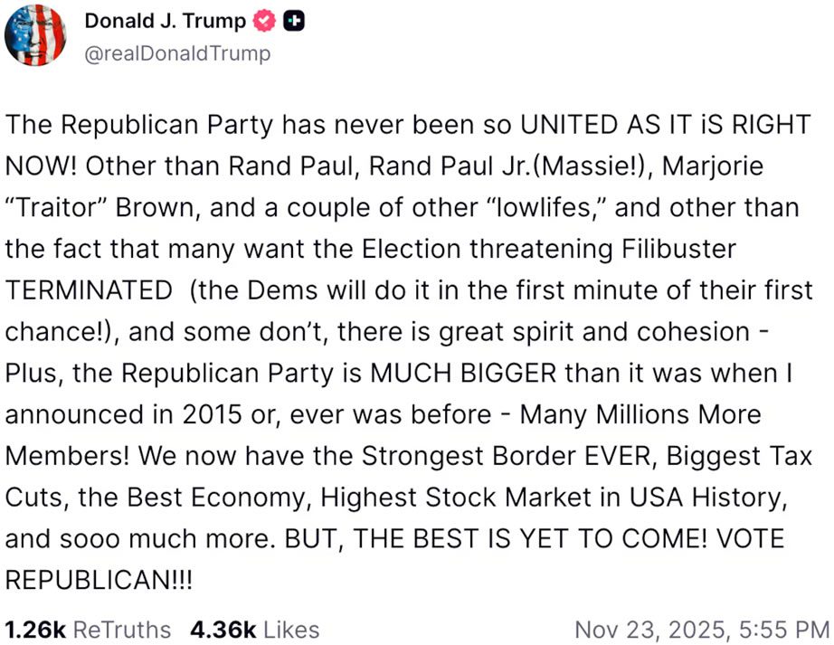 Παρά τις επιθέσεις του Τραμπ, ο οποίος χαρακτήρισε τους επικριτές του εντός του κόμματος ως «αλήτες» (lowlifes) και επιμένει ότι το κόμμα είναι ενωμένο, η πραγματικότητα δείχνει διαφορετική. Εάν ο Λευκός Οίκος συνεχίσει να αγνοεί τις ρίζες του απομονωτισμού που τον έφεραν στην εξουσία (η βασική ιδεολογία του MAGA), ο εμφύλιος στους κόλπους των Ρεπουμπλικανών ίσως να είναι αναπόφευκτος.